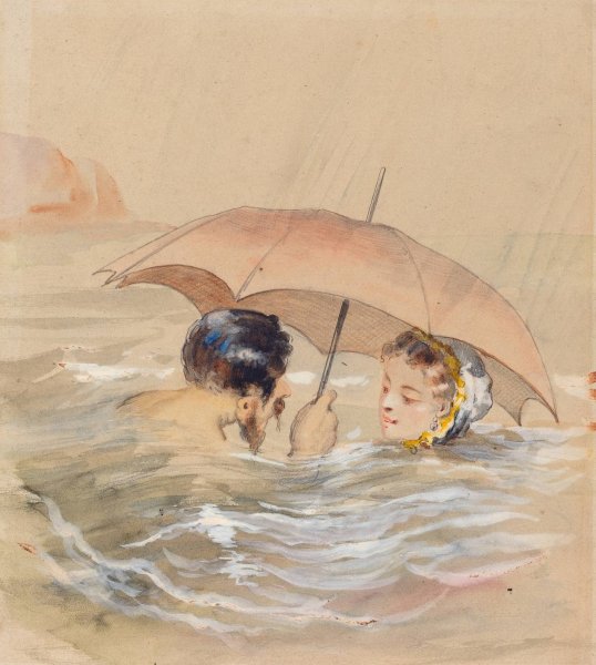 Male and Female Bathers with Umbrella by Alfred Grevin is a hand-painted oil painting reproduction on canvas painted by one of our highly skilled artists. All of our Alfred Grevin oil painting reproductions are meticulously painted to the highest museum quality by our master artists utilizing the finest quality oil paints on artist grade cotton canvas.