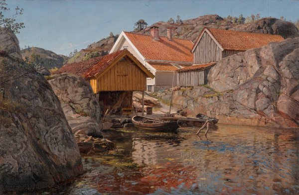 Mellom klipper. Mol, Ny-Hellesund by Amaldus Nielsen is guaranteed to be hand-painted on canvas by a master artist that has years of training and experience in capturing every brushstroke detail, color palette, and overall beauty of the original oil painting.