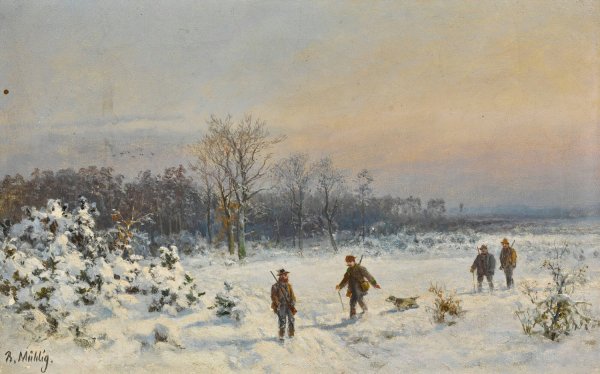 Hunters in the snow by Bernhard Muhlig is a hand-painted oil painting reproduction on canvas painted by one of our highly skilled artists. All of our Bernhard Muhlig oil painting reproductions are meticulously painted to the highest museum quality by our master artists utilizing the finest quality oil paints on artist grade cotton canvas.