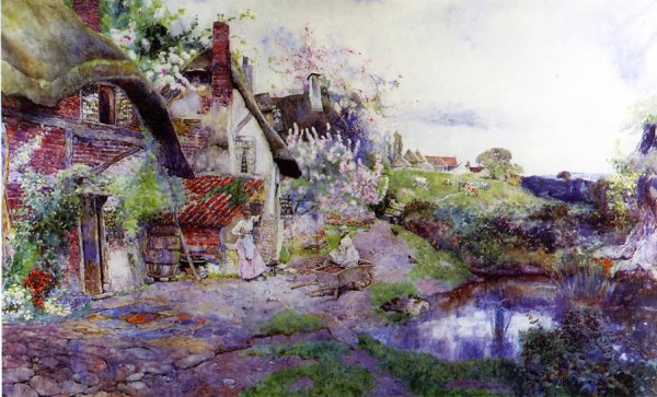 An English Idyll, Figures Outside a Thatched Cottage by David Woodlock is a hand-painted oil painting reproduction on canvas painted by one of our highly skilled artists. All of our David Woodlock oil painting reproductions are meticulously painted to the highest museum quality by our master artists utilizing the finest quality oil paints on artist grade cotton canvas.