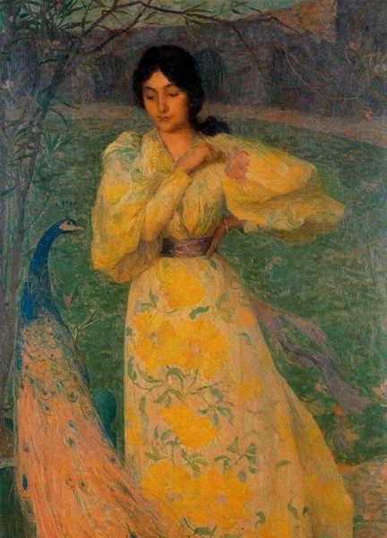 Woman with Peacock also known as Giovane Donna con Pavone by Edmond Francois Aman-Jean is a hand-painted oil painting reproduction on canvas painted by one of our highly skilled artists. All of our Edmond Francois Aman-Jean oil painting reproductions are meticulously painted to the highest museum quality by our master artists utilizing the finest quality oil paints on artist grade cotton canvas.