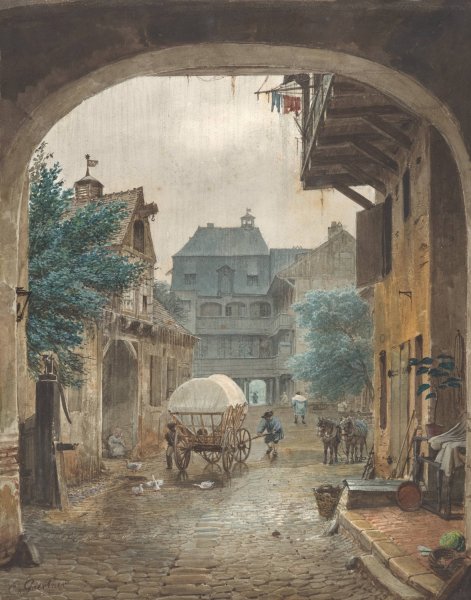 View into the Courtyard of an Inn at Colmar by Eduard Gaertner is a hand-painted oil painting reproduction on canvas painted by one of our highly skilled artists. All of our Eduard Gaertner oil painting reproductions are meticulously painted to the highest museum quality by our master artists utilizing the finest quality oil paints on artist grade cotton canvas.