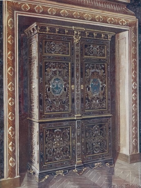 Armoire in ebony with inlays of engraved brass and white metal by Edwin Foley is a hand-painted oil painting reproduction on canvas painted by one of our highly skilled artists. All of our Edwin Foley oil painting reproductions are meticulously painted to the highest museum quality by our master artists utilizing the finest quality oil paints on artist grade cotton canvas.