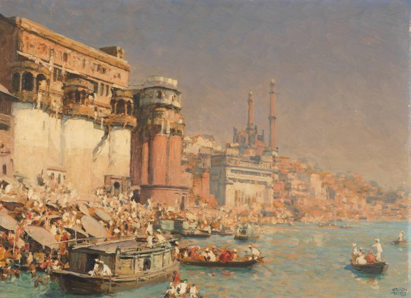 Munshi Ghat in Varanasi on the Ganges, India by Erich Kips is guaranteed to be hand-painted on canvas by a master artist that has years of training and experience in capturing every brushstroke detail, color palette, and overall beauty of the original oil painting.