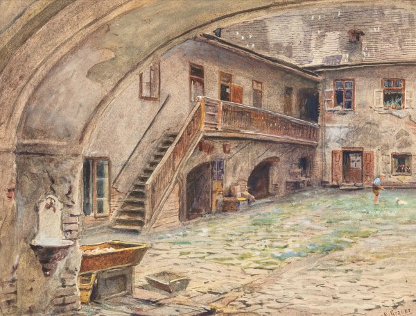 Hof in der Kahlenbergerstrase by Ernst Graner is a hand-painted oil painting reproduction on canvas painted by one of our highly skilled artists. All of our Ernst Graner oil painting reproductions are meticulously painted to the highest museum quality by our master artists utilizing the finest quality oil paints on artist grade cotton canvas.