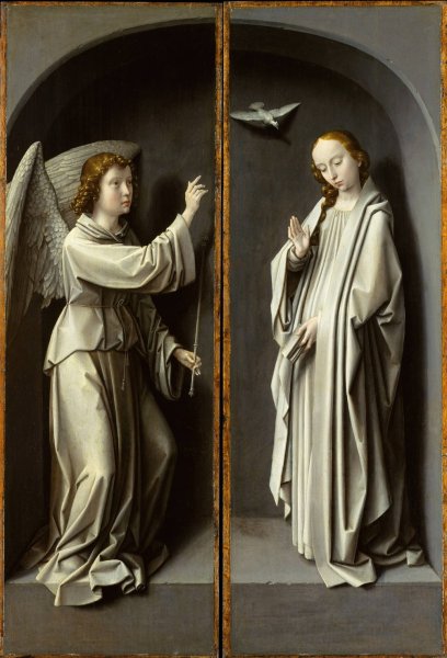 Archangel Gabriel; The Virgin Annunciate by Gerard David is a hand-painted oil painting reproduction on canvas painted by one of our highly skilled artists. All of our Gerard David oil painting reproductions are meticulously painted to the highest museum quality by our master artists utilizing the finest quality oil paints on artist grade cotton canvas.