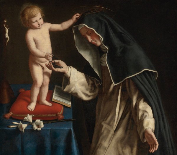 St. Catherine Of Siena Receiving The Crown Of Thorns from The Christ Child by Giovanni Battista Salvi Da Sassoferrato is guaranteed to be hand-painted on canvas by a master artist that has years of training and experience in capturing every brushstroke detail, color palette, and overall beauty of the original oil painting.