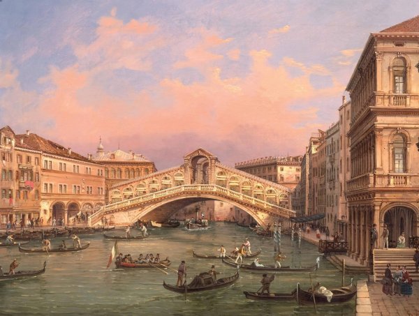 Venice, A View Of The Rialto Bridge by Giovanni Grubacs is guaranteed to be hand-painted on canvas by a master artist that has years of training and experience in capturing every brushstroke detail, color palette, and overall beauty of the original oil painting.
