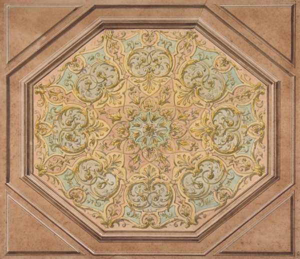 Design for the decoration of a hexagonal ceiling with rinceaux by Jules-Edmond-Charles Lachaise is guaranteed to be hand-painted on canvas by a master artist that has years of training and experience in capturing every brushstroke detail, color palette, and overall beauty of the original oil painting.
