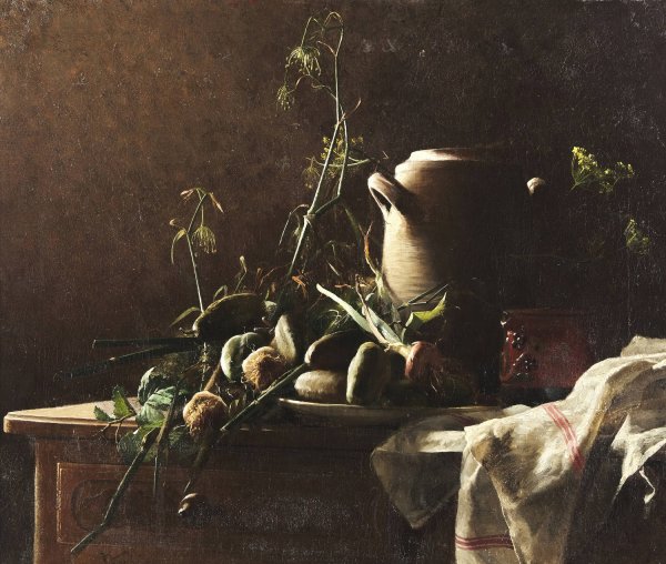 Still Life with Leeks, Potatoes and Fennel on Commode Tabletop by Robert Wylie is guaranteed to be hand-painted on canvas by a master artist that has years of training and experience in capturing every brushstroke detail, color palette, and overall beauty of the original oil painting.