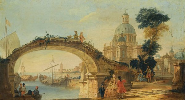 A Capriccio View With A Footbridge Over A River, A Large Cathedral In The Background by The Pseudo Battaglioli is guaranteed to be hand-painted on canvas by a master artist that has years of training and experience in capturing every brushstroke detail, color palette, and overall beauty of the original oil painting.