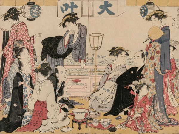 Entertainment on a Balcony by the Water at Nakasu, from the series, A Collection of Beautiful Modern Women of the Pleasure Quarters by Torii Kiyonaga is a hand-painted oil painting reproduction on canvas painted by one of our highly skilled artists. All of our Torii Kiyonaga oil painting reproductions are meticulously painted to the highest museum quality by our master artists utilizing the finest quality oil paints on artist grade cotton canvas.