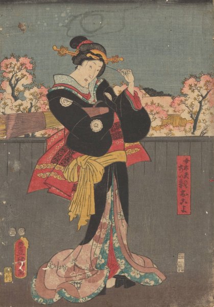 Woman with Black Wrap against Grey Fence (cherry trees in bloom in background) by Toyokuni Utagawa is a hand-painted oil painting reproduction on canvas painted by one of our highly skilled artists. All of our Toyokuni Utagawa oil painting reproductions are meticulously painted to the highest museum quality by our master artists utilizing the finest quality oil paints on artist grade cotton canvas.